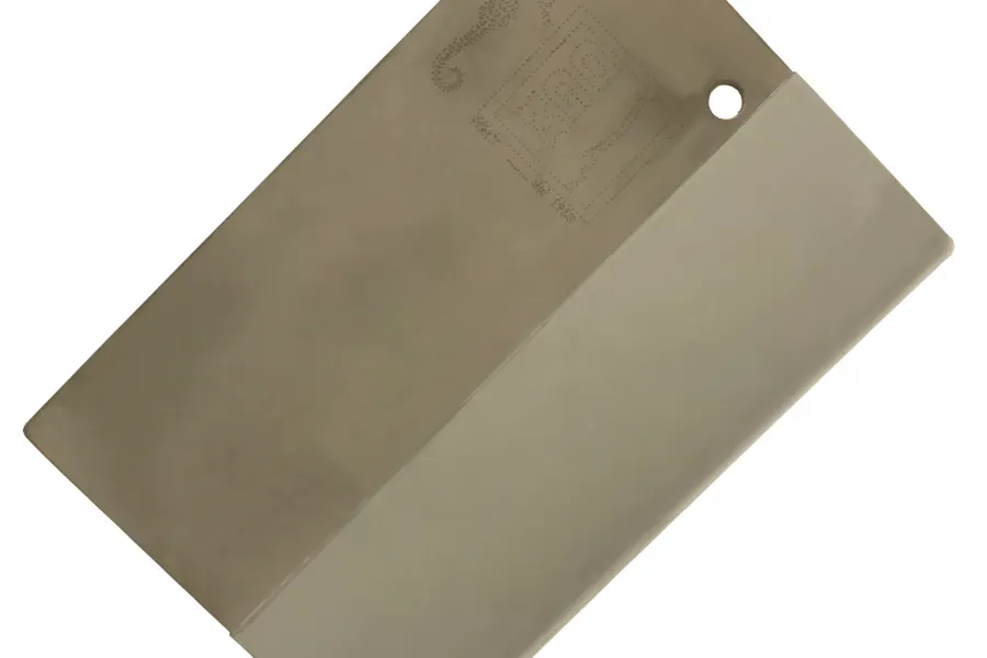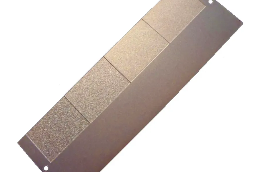 A set of two panels made by plating a brass panel first with brittle nickel, then with chrome. The panels are approx. 1.5” (36 mm) in width and 4” (101 mm) in length, are machined from the same stock and have corresponding cracks. They are particularly effective in assessing the penetrant inspection system’s ability to detect surface discontinuities. It results to be very handy for simultaneous comparison of the penetrants from two batches. Sold in sets of two, with photographs.