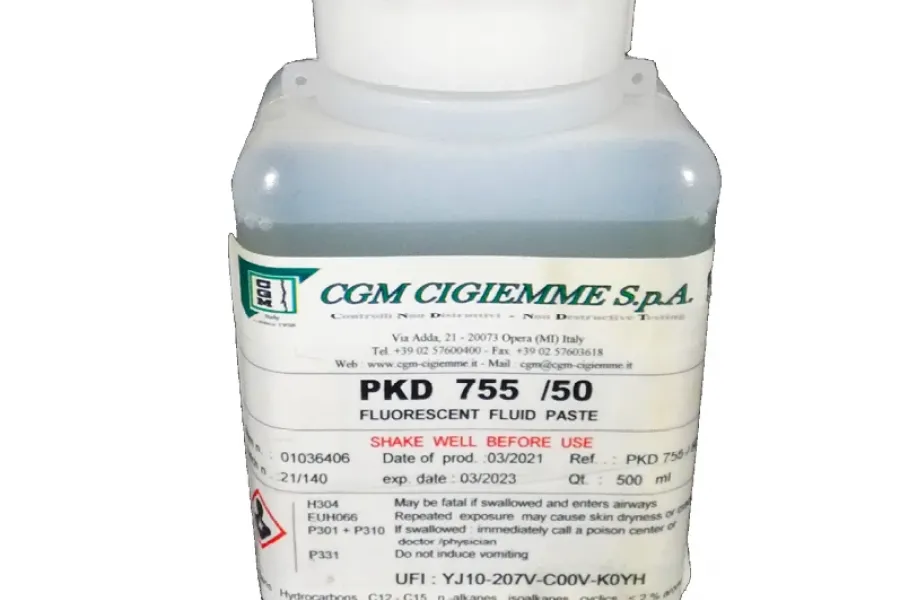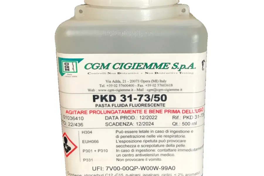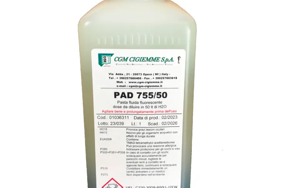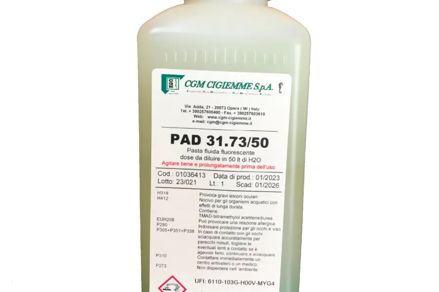 PAD 31-75/100 is a fluid concentrate of fluorescent magnetic powder to be diluted in water, for wet magnetic particle inspection method.