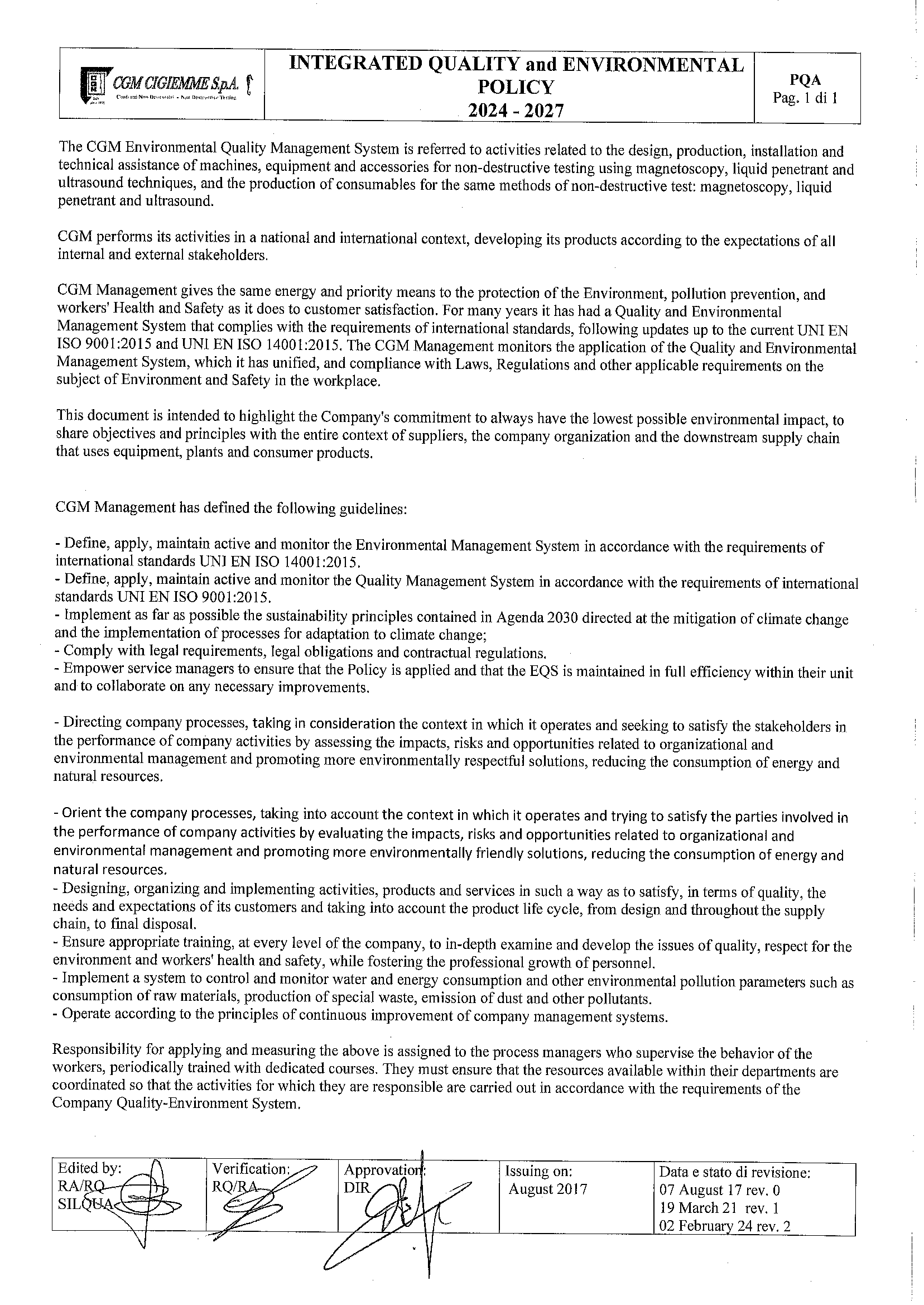 Since long ago, CGM CIGIEMME S.p.A. arranged a Quality and Environmental Management System (QEMS) that suited its organisation, activities and specialisations, in order to demonstrate its ability to regularly provide products, services and performances that comply with customer and applicable mandatory requirements, with the intention of implementing and maintaining an effective management of internal processes, as established by the Quality and Environmental Policy defined and disseminated by the company Management.