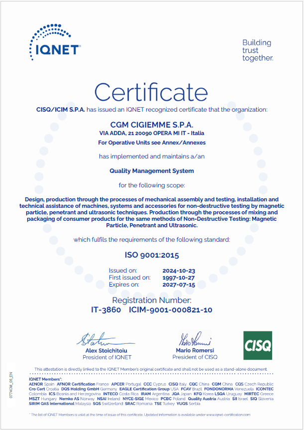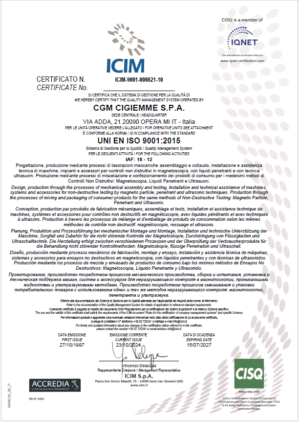 Accordingly to this, since 1997 CGM CIGIEMME S.p.A. can boast the obtaining of ISO 9001 certification – periodically renewed – which attests the effectiveness of quality measures and provisions in relation to its organisational and production processes.