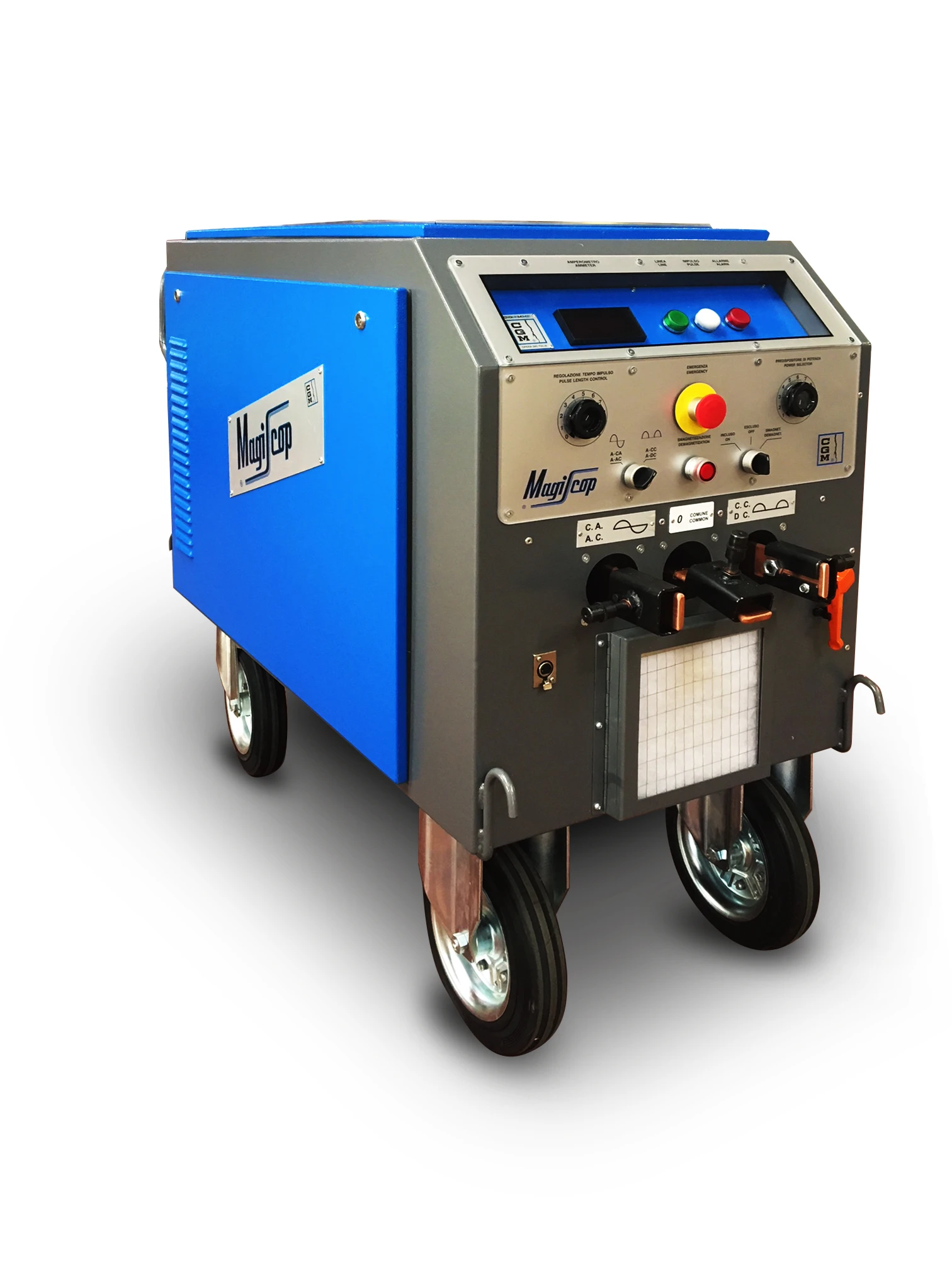 CGM CIGIEMME S.p.A. produce due versioni di generatori: “Cantiere” e “New”. Nella versione Cantiere, la commutazione tra CA e CC avviene manualmente spostando fisicamente il cavo dal contatto CA al contatto CC. La smagnetizzazione viene effettuata rampa elettronica automatica decrescente fino a zero in CA. Nella versione “New”, la commutazione tra CA e CC avviene tramite selettore ed è gestita automaticamente dal generatore. Inoltre, la smagnetizzazione può avvenire con rampa elettronica automatica decrescente fino a zero sia in CA che in CC con inversione di polarità.